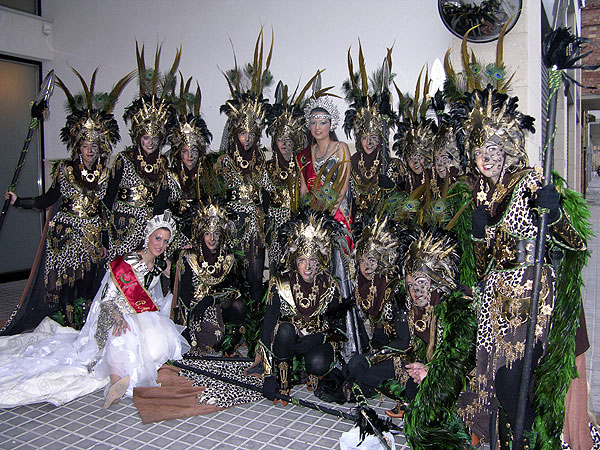 Les representants de la filà Sara Payá Pla i Inés Murcia Ferre amb l'esquadra especial d'amigues abans d'eixir a l'Entrada.