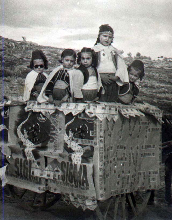 Milagros Conejero Martínez; Maribel Avellán Mateu; Carmen Conejero Albero; Amparo Jordá Cots i Fina Albero Bodí damunt d'una carrossa.