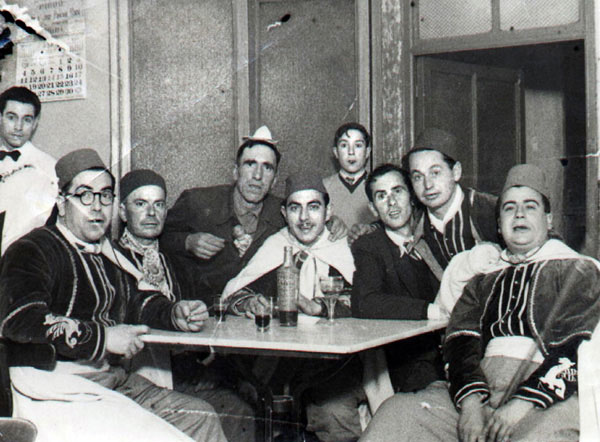 D'esquerra a dreta, Francisco Avellán Antolí; Francisco Llorca Montava, "Quico conill"; Santiago Llopis [?]; Alfonso Ribera, "el de la Fonda"; el xiquet Teócrito Rizo Martí, "Tino"; Rafael Martí, "Felo Paxola" (sogre de "Caxorro" el del restaurant Mariola); Fernando Murcia Lillo, "Safranero" i Alberto Belda Belda, "Cabasset".