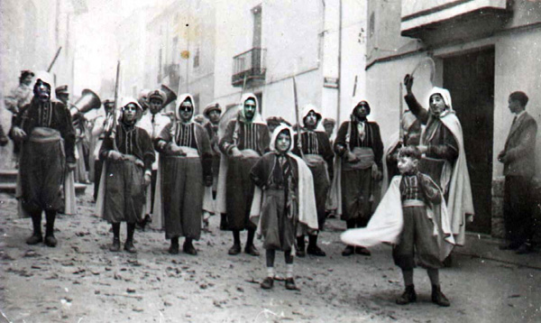 D'esquerra a dreta, Ricardo Berenguer Ferre, "el del Forn"; Francisco Belda, "Sandàrio"; Alberto Belda Belda, "Cabasset"; Francisco Beneyto Fillol, "Suc"; Alfonso Albero Puig, "Tronsa"; Vicente Antonio Mataix, "Serrella" [?] i el cap d'esquadra José Pascual Calabuig, "roig de Perolit".